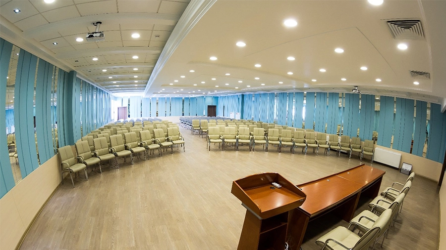 Большой конференц-зал, рассчитанный на 200 человек, является одним из самых красивых, вместительных и современных в нашем городе. Его общая площадь составляет 310 кв.м. Два проектора, телевизоры, компьютерная техника и проекторные полотна большого размера не заставит Вас думать об ограничениях в техническом вопросе при выступлении. Акустическая аппаратура, установленная по всему залу, и микрофоны помогут донести все ваши слова до слушателей. Зал оснащен удобными стульями и креслами, а в зависимости от формата и цели вашего мероприятия расставляются столы. Также в вашем распоряжении стол для президиума с трибуной, за которым размещаются руководители и высокие должностные лица.